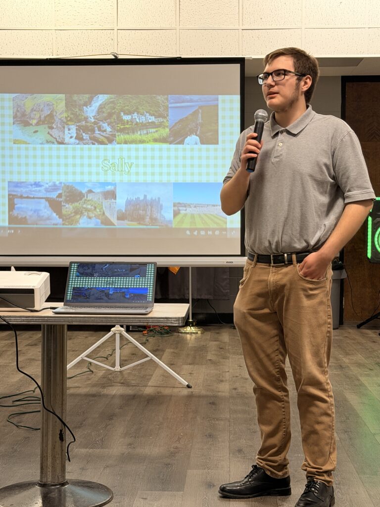 Jacob Schmidt, 2025 IASCW Irish Life Experience scholar presents to the Banquet crowd.